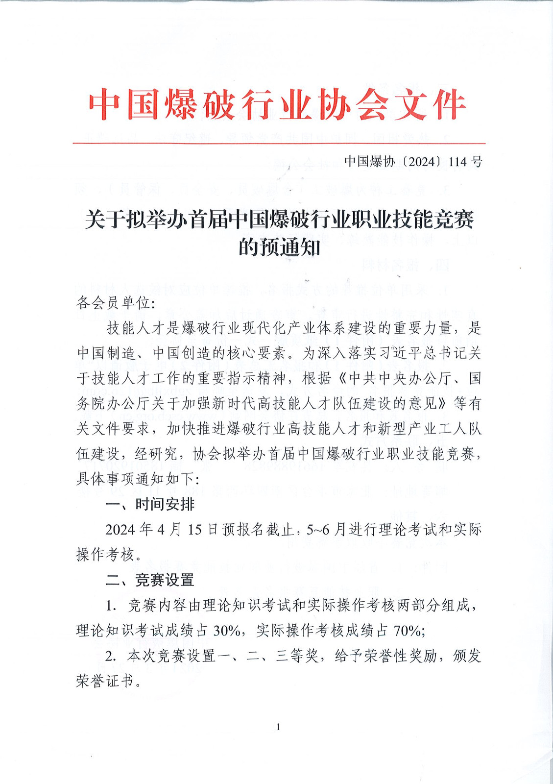 关于拟举办首届中国爆破行业职业技能竞赛的预通知
